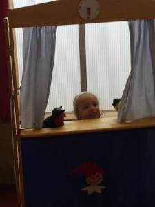 Another holiday day: one day, I came to pick up my daughter from the holiday resort’s kids club, and when I checked in, I was told she was in the puppet corner. There she was indeed, playing out a puppet story to a captive audience* – in German!